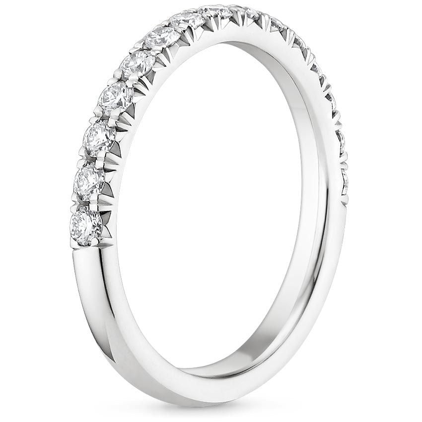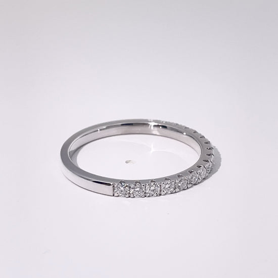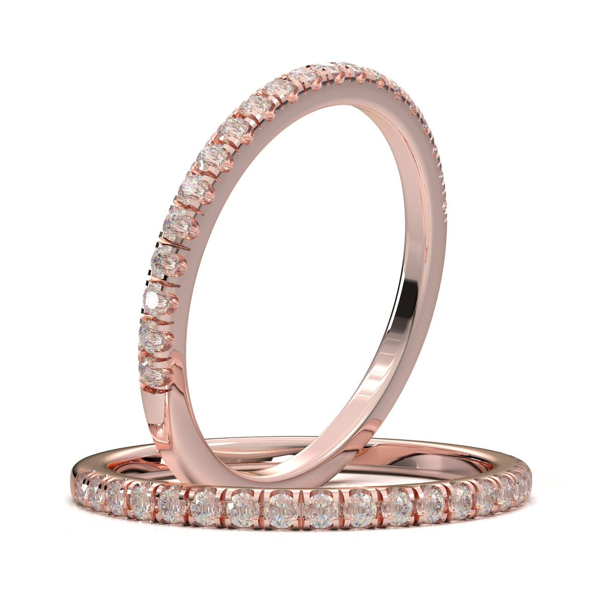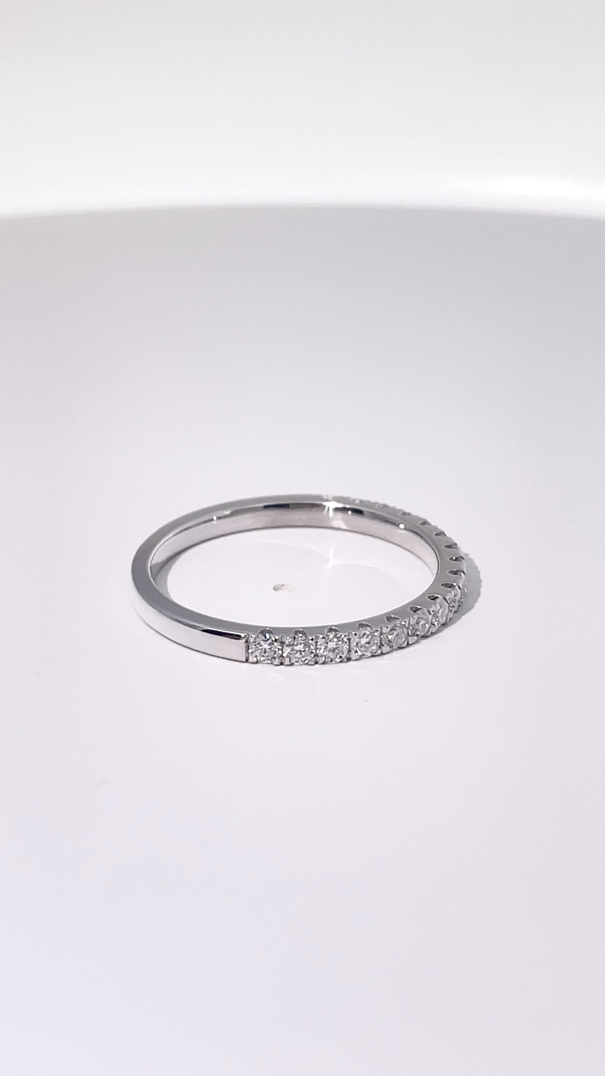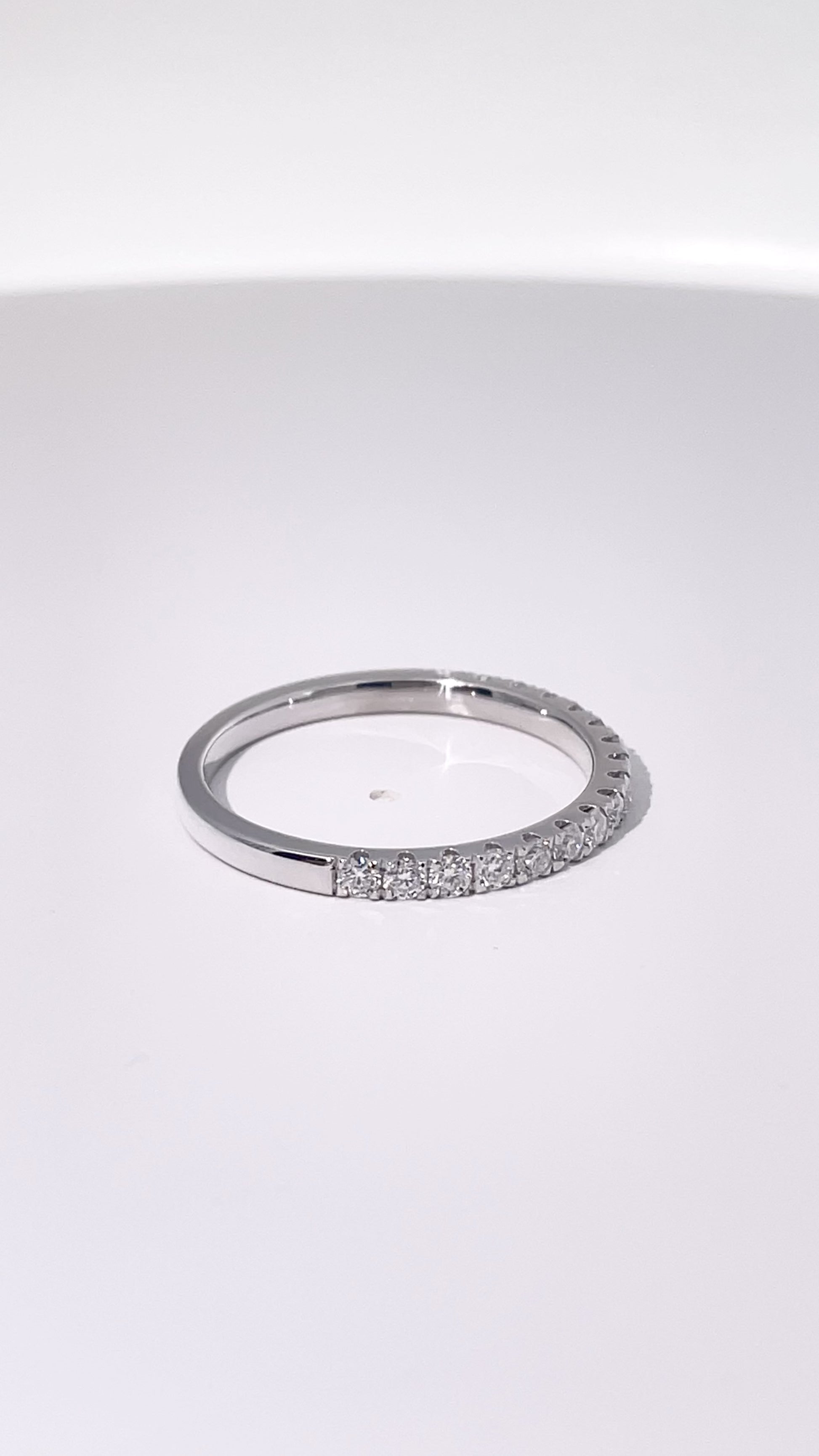 The Jessica wedding band features a delicate 2mm thickness and is adorned with a half-eternity row of sparkling Moissanite stones, offering enduring brilliance.