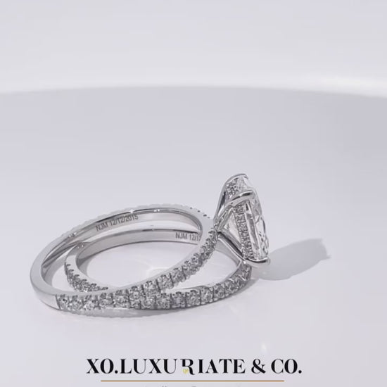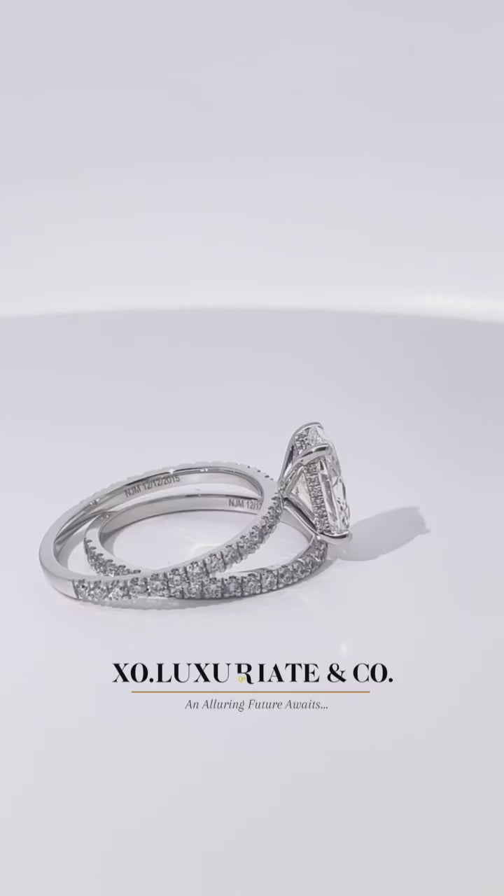 The "Malachi” Wedding Set features a stunning 3ct Lab Grown Diamond oval cut | D VVS1 main stone, set in a traditional setting, accented by a hidden halo design and 2mm thick 2/3 Eternity band. Paired with a 2mm thick 2/3 eternity wedding band, this timeless set is perfect for any bride (All Lab Grown Diamond).